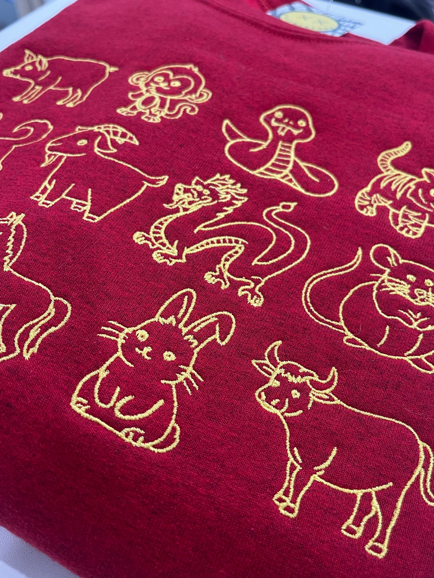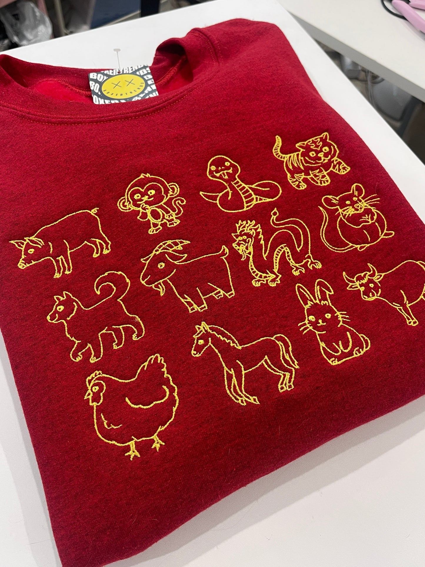 Celebrate the Lunar New Year in style with this custom embroidered sweatshirt, perfect for adding a touch of cultural significance to your wardrobe.
